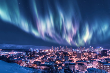 A stunning display of aurora-like lights fills the city skyline, creating a mystical atmosphere as darkness sets in and urban buildings glimmer under the colorful glow