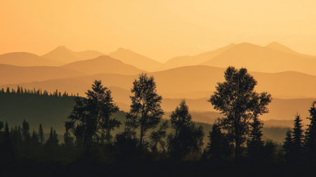 A tranquil sunset scene featuring distant mountains and silhouetted trees, enveloped in warm hues, capturing nature's beauty and peaceful atmosphere.