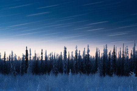 Dark blue sky with clouds at night over the spruce forests of the Northern taiga of Yakutia.