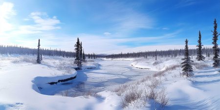 A serene river winds through snow-blanketed landscapes, surrounded by majestic mountains under a bright blue sky. The peaceful scene captures the beauty of winter.