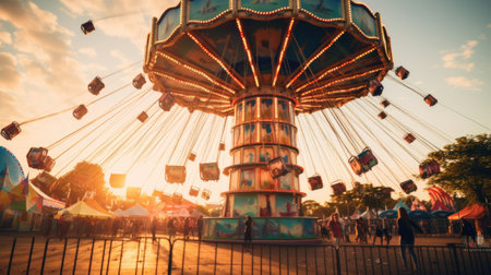 Amusement park at sunset in Paris, France. People on the background, people at the Oktoberfest in Munich, Beer tents and fairground rides on the Oktoberfest in Munich, AI Generated