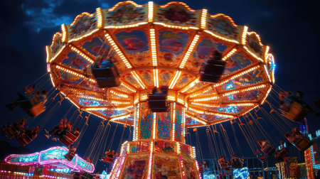 Exciting long exposure capture of vibrant amusement park rides in motion at night