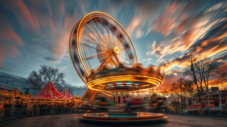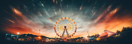 Vibrant sunset colors on a ferris wheel carnival or fair ride at night