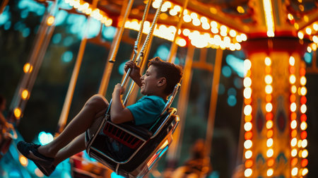 thrill of carnival rides, with bright lights and a bustling carnival atmosphere in the background..