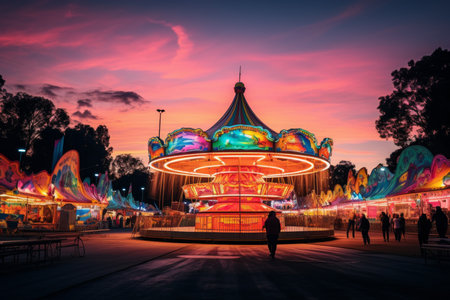 Vivid carousel in motion creates a playful blur of colors at night carnival