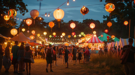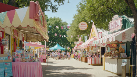 A lively fairground scene featuring colorful stalls and decorations, bustling with visitors enjoying summer fun and food, creating a vibrant community atmosphere.