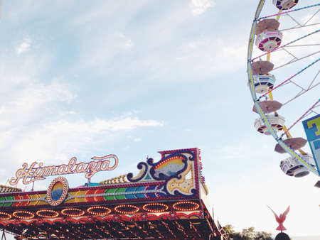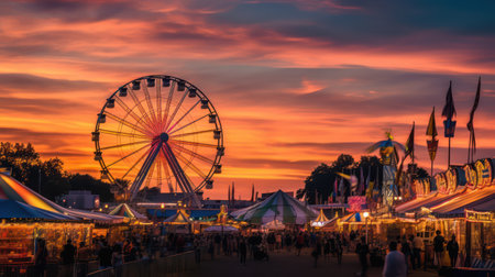 Sunset at the fairground with a ferris wheel in the foreground
