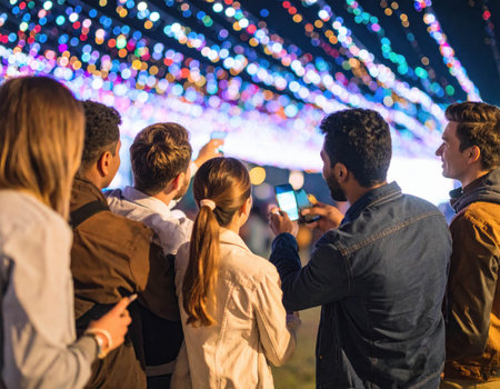 Groups of friends gather excitedly to capture a dazzling light display at a festival. Their smartphones illuminate their faces as they enjoy the evening atmosphere together.