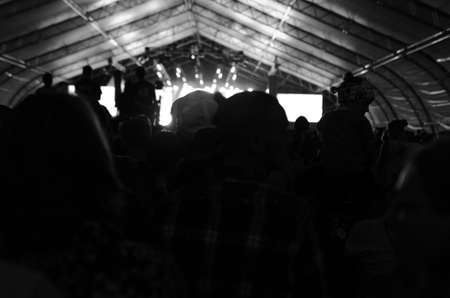 Silhouette of a big crowd at concert against a brightly lit stage. Night time rock concert with people having fun lifting hands up in the air and cheering the musicians.