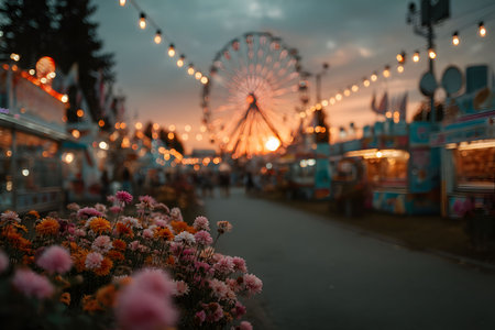 A vibrant carnival scene features a glowing ferris wheel under a sky transitioning from day to dusk. strings of lights illuminate the lively atmosphere, while pink and orange flowers in the foreground add a touch of natural beauty. Generative AI