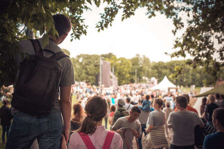 Young handsome party boy,People on music festival in the summer, back view, big group at party with dj, summer nightlife, disco club outside, fun youth, entertainment festive concept, male back view happy