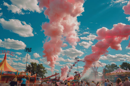 Cotton candy clouds floating above the circus grounds --ar 3:2 Job ID: 6bcba540-99b4-47e2-ab59-49cf87c890a6