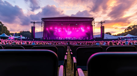 A captivating outdoor concert scene featuring a lively audience captivated by vibrant stage lights during a stunning sunset, creating an unforgettable atmosphere.