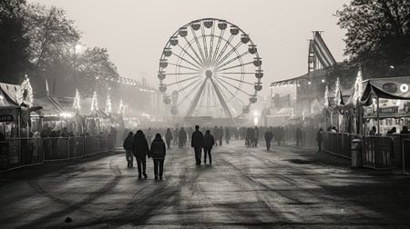 Amusement park in the misty morning. Black and white