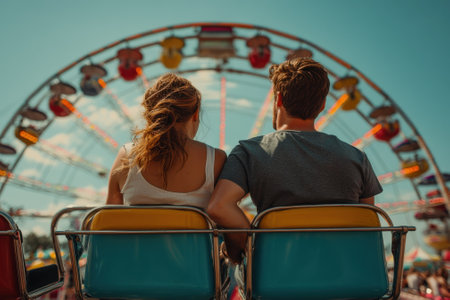 A couple sits together on a Ferris wheel, surrounded by vibrant lights and a festive atmosphere during sunset.