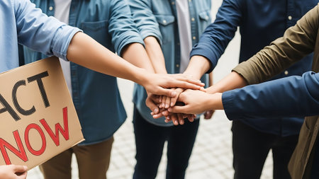 Group of people stacking hands in unity, one person holding a cardboard sign.