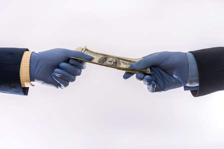 Two hands holding or gives US dollar in medical gloves for protect, quarantine period covid19