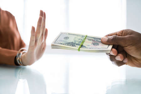 A man businessman in a suit refuses of money that is held in the hands of a person offering a bribe. Concept of bribery and corruption