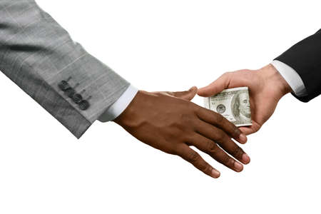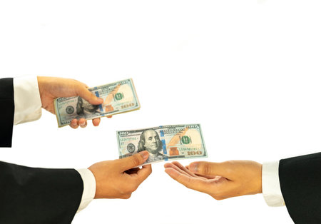 Two people are handing each other dollar bills, they are mutually beneficial business partners, they commit bribery fraud for business interests. The concept of corruption and bribery.