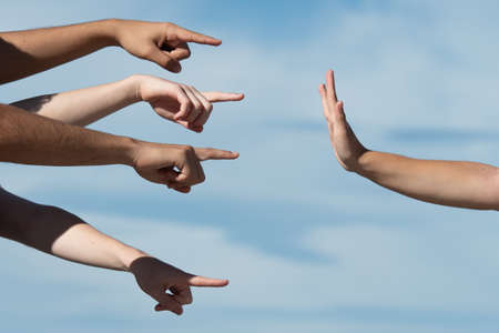 Hands pointing to a person making the stop gesture with the palm. Accusation and guilt concept.