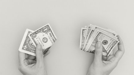 Selective focus on detail of USD banknotes. Counting or giving United States Dollars banknotes. World money concept, inflation and economy concept