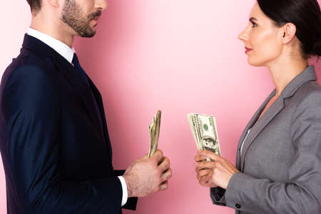 side view of businesswoman looking at businessman holding dollar banknotes on pink, gender equality concept
