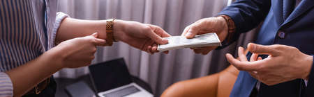 Cropped view of business partners holding dollar banknotes in restaurant, banner