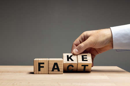 Male hand flips wooden cubes with words fake to fact on wooden table over grey background. Copyspace for ad.