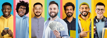 Group of Diverse People Celebrating Success With Money and Smiles in a Colorful Backdrop