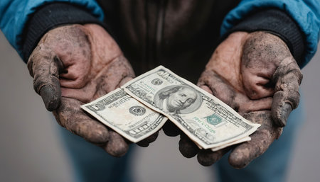 A few bills in his hand on a dark background. Copy space.