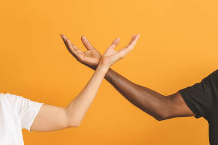 Hands of Caucasian woman and African-American man on color background. Racism concept
