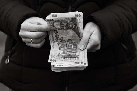 Selective focus on detail of LEI banknotes. Counting or giving Romanian LEI banknotes. World money concept, inflation and economy concept