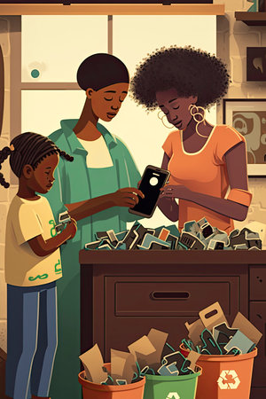 A group of diverse friends gathers in a living room for a clothing swap party, holding up garments and eco-friendly bags. They are smiling and exchanging items, promoting sustainable fashion and recycling in a fun social setting.