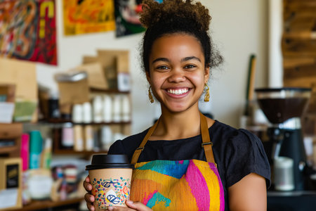 Barista in a coffee shop holding a to-go coffee cup. The barista is wearing a colorful apron and standing in front of a background filled with various coffee shop supplies and decor.