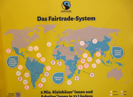 BERLIN, GERMANY, January 16th 2026: Photo of A Fairtrade system map is displayed at the Internationale Grüne Woche trade fair in Berlin Germany The map shows the global reach and impact of the Fairtrade system across various countries and regions.