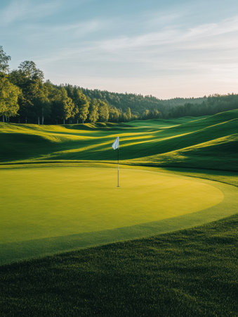 A serene golf course with a flag at the hole, set in lush hills, bathed in soft evening light, allows room for branding.