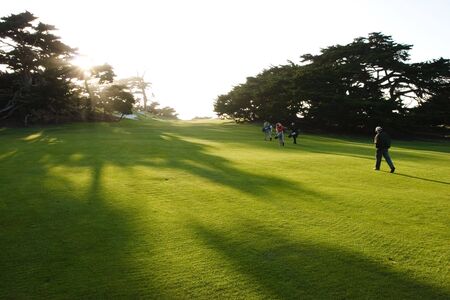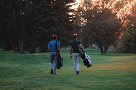 Two individuals are seen strolling across a verdant lawn, each carrying a golf bag. The image showcases a natural outdoor setting, likely during late afternoon or early evening due to the warm lighting. The composition features a perspective view. The scene suggests recreational activity, suitable for various editorial and commercial applications.