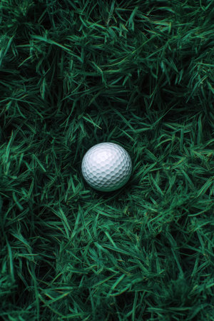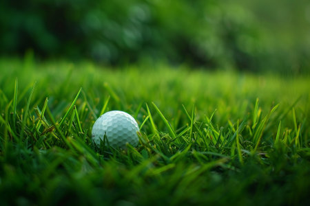 An engaging close-up image of a golf ball resting in vibrant green grass with a golf club nearby, capturing the essence of outdoor sports in a natural setting.
