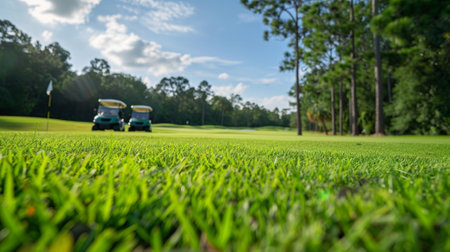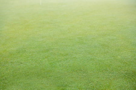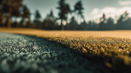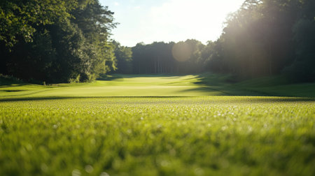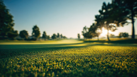 Captivating close-up of a golf course showcasing vibrant green grass and soft turf illuminated by bright sunlight, evoking a sense of peace and leisure.