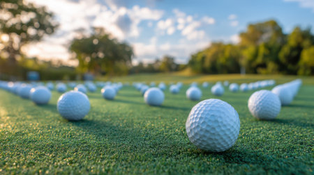 This image captures a serene array of golf balls scattered across the green turf, enhanced by the warm sunlight and a picturesque sky, ideal for sports enthusiasts.