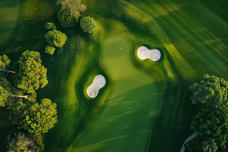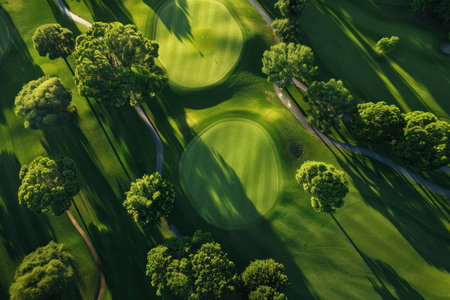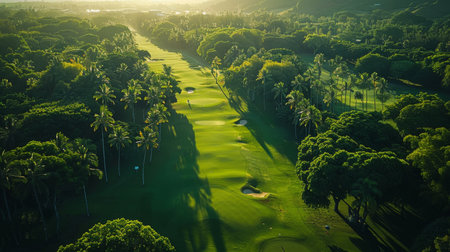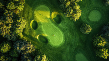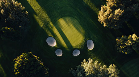 A serene aerial view of a golf course showing vibrant green grass, sand bunkers, and extending shadows under the afternoon sun, inviting leisure.