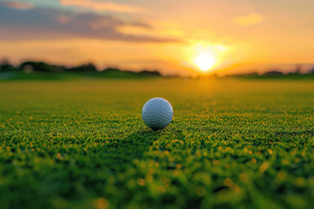 A golf ball is positioned on lush green grass with the soft glow of sunset in the background. The scene captures a peaceful moment on a golf course. AI Generative