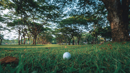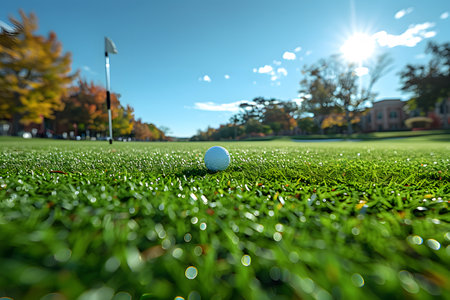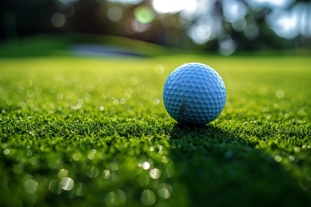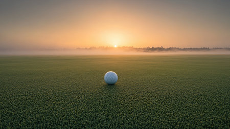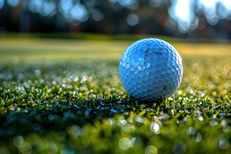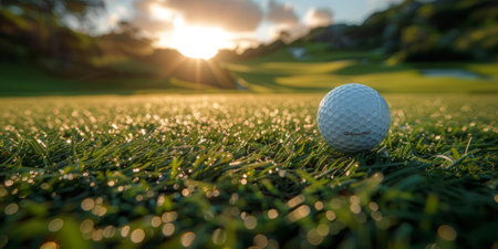Golf ball on a lush green grass with morning dew under the golden glow of sunrise, set on a scenic golf course.