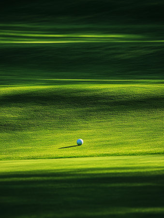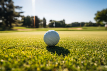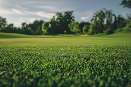 A golf ball sits atop a lush green field, ready to be struck by a golf club. The bright green grass contrasts with the white ball, creating a striking focal point in the landscape. Generative AI