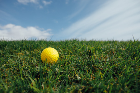 yellow golf ball on green grass background, closeup view