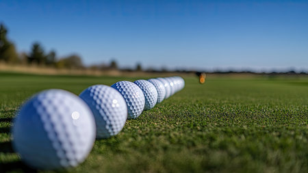 A row of pristine golf balls lined up next to a set of irons and woods, ready for a day on the course, with a clear blue sky overhead.