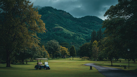 A serene golf course scene with a golf cart parked on lush green grass, framed by majestic mountains under a dramatic overcast sky, ideal for relaxation.
