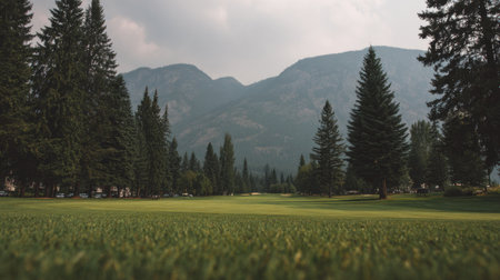 A picturesque golf course stretches across a lush green landscape, framed by tall trees and majestic mountains under a soft, cloudy sky, inviting relaxation.