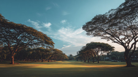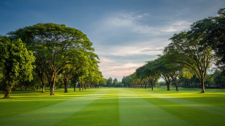 A stunning golf course fairway, framed by tall trees and bathed in soft light, captures nature's beauty in a tranquil setting perfect for relaxation and recreation.