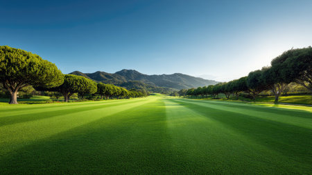 A stunning view of a golf course with vibrant green grass, majestic mountains, and a clear blue sky, showcasing the beauty of nature and tranquility of outdoor leisure activities.